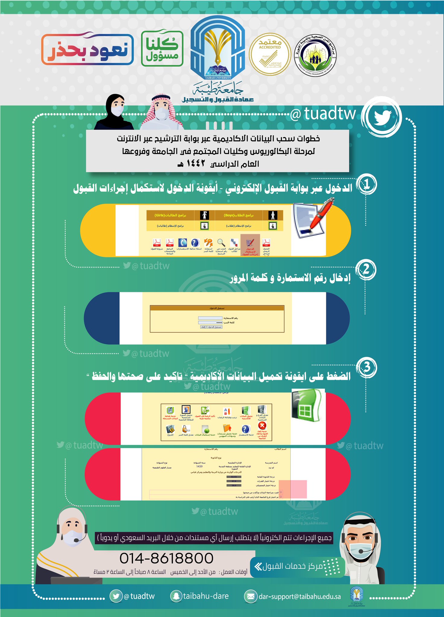 التسكين بعد المسار العلمي الموحد النتائج للعام 1439 1440 التسكين بعد المسار العلمي الموحد النتائج للعام 1438 1439. المركز الاعلامي أعلنت جامعة طيبة يوم أمس عن فتح باب الترشيح للقبول في كلياتها في المدينة المنورة والفروع للعام الدراسي1437 1438هـ عن طريق موقع الجامعة على شبكة الإنترنت www taibah u edu sa أوضح ذلك عميد القبول والتسجيل بالجامعة. ما ظهر من أسماء المقبولين في جامعة طيبة 1442 هي ق بول مبدأي ويتم تأكيده من قبل الطلبة لكي تعمل الجامعة على ملأ المقاعد الشاغرة بالطلبة أصحاب الأولوية وفق نسب القبول للإلتحاق في الكليات والأقسام. العلا الدراسة برسوم شروط الترشيح للقبول في الانتساب لعمادة التعليم الموازي و المستمر الدراسة برسوم 1.