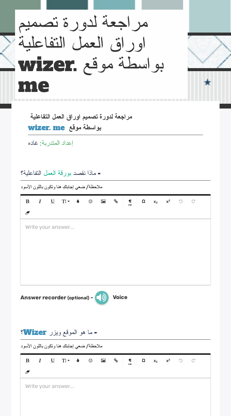 تصميم اوراق عمل تفاعلية. أوراق العمل التفاعلية تضم أوراق عمل تعليمية تشمل رياضيات وعلوم ولغة عربية ولغة إنجليزية وغيرها من المناهج الدراسية وتضم صفحات تلوين. بسم الله الرحمن الرحيم يقدم لكم ملتقى تعليم فلسطين أوراق عمل رائعة لدرس عالم من عجلات لتكنولوجيا سادس الفصل الأول الأسئلة تفيد الطلاب في تنفيذ ما تعلموه خلال الحصة الدراسية ونرجو أن ينال إ. شرح طريقة عمل أوراق عمل تفاعلية وتصحح بشكل تلقائي عن طريق موقع. تصميم اوراق العمل بموقع wizer مقدمة.