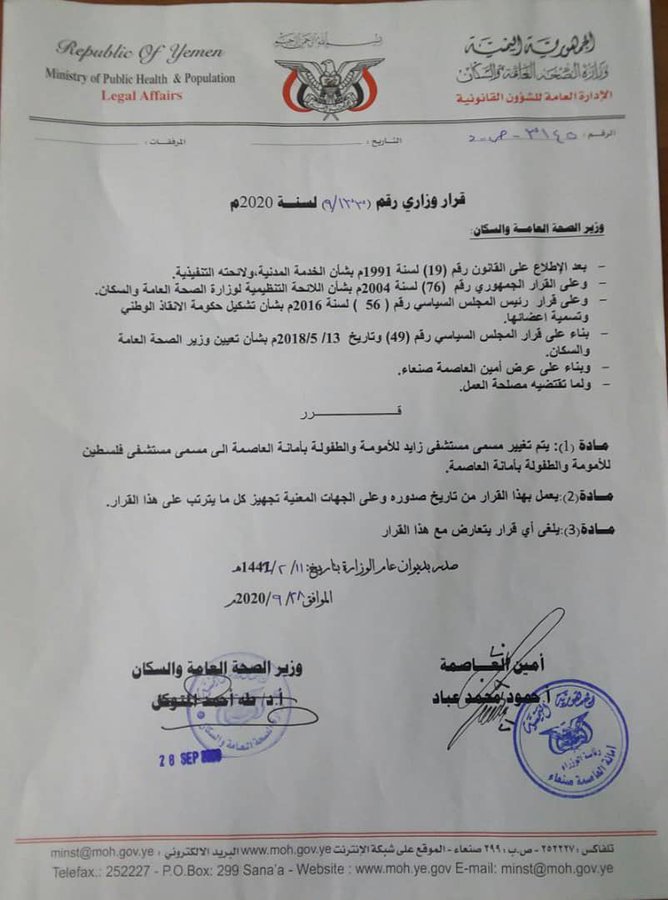 اليمن تغير اسم مستشفى زايد في صنعاء إلى فلسطين